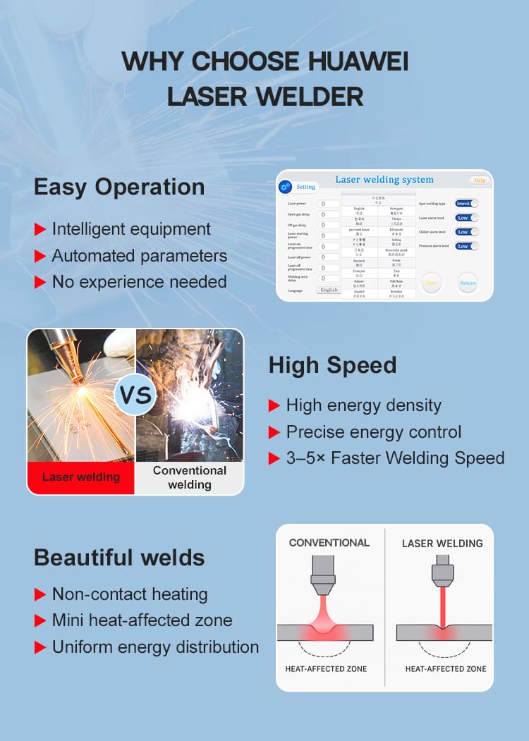 ElLÁSER HUAWEI Soldadora láser duradera 4 en 1 de 1500W 2000W 3000Wes un alto rendimientoMáquina de soldadura láser de manodiseñado para proporcionar estabilidad duradera, capacidad multifunción y procesamiento de metales de alta calidad para compradores industriales. Integrando soldadura, corte, limpieza y pulido en un único sistema robusto, elLÁSER HUAWEISoldadora láser duradera 4 en 1 de 1500W 2000W 3000WGarantiza costuras de soldadura suaves, fuerte penetración y tratamiento superficial eficiente en acero inoxidable, acero al carbono, aluminio y otros metales. Su fuente láser de fibra duradera ofrece resultados confiables con requisitos de mantenimiento reducidos, mientras que el diseño portátil ergonómico admite una operación cómoda y flexible. Construido para uso industrial continuo, elLÁSER HUAWEI Soldadora láser duradera 4 en 1 de 1500W 2000W 3000Wofrece un rendimiento confiable para talleres de fabricación, tareas de reparación y necesidades de producción personalizadas.