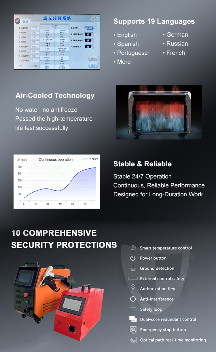 ElLÁSER HUAWEI Soldadora láser portátil refrigerada por aire de 800W y 1200W lista para dispositivos móviles para soldadura de metales en el sitioes un flexibleMáquina de soldadura láser de manoDiseñado para un rendimiento confiable en entornos de campo y taller. Su sistema enfriado por aire proporciona un control térmico estable con bajo mantenimiento, mientras que el diseño portátil permite una fácil maniobrabilidad durante las tareas de soldadura de metales en el sitio. ElLÁSER HUAWEI Soldadora láser portátil refrigerada por aire de 800W y 1200W lista para dispositivos móviles para soldadura de metales en el sitioOfrece costuras de soldadura suaves, rendimiento constante y mínima distorsión térmica en materiales como acero inoxidable, acero al carbono y aluminio, lo que lo convierte en una excelente opción para aplicaciones de fabricación, reparación, ensamblaje y soldadura personalizadas donde la movilidad y el rendimiento confiable son esenciales.
